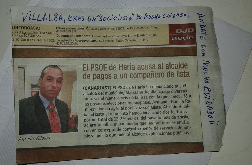 Según ha denunciado el edil, el pasado viernes llegó a las oficinas municipales de Haría un sobre a su nombre que contenía recortes de prensa referidos a la contratación del número seis de la lista de Coalición Canaria al citado municipio. Sobre los recortes se había escrito a mano un mensaje amenazante.