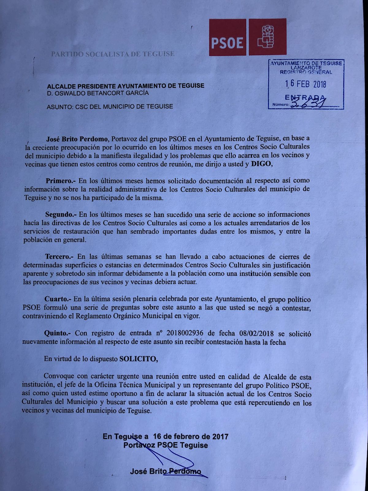 “En el último pleno del 7 de febrero realizamos una serie de preguntas y el alcalde se negó a contestarla”, añade el socialista. “Por lo tanto solicitamos una reunión urgente entre el alcalde, el jefe de la oficina técnica y nuestro partido con el fin de solucionar este asunto, tendiendo una vez más nuestra mano por el bien del municipio”