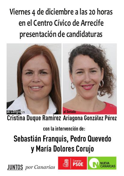 A las 20,00 horas de ese mismo viernes, Franquis y Pedro Quevedo, número dos de la lista al Congreso de los Diputados, protagonizarán un mitin en el Centro Cívico de Arrecife con la asistencia de Ariagona González y la número cinco al Parlamento nacional, Cristina Duque.