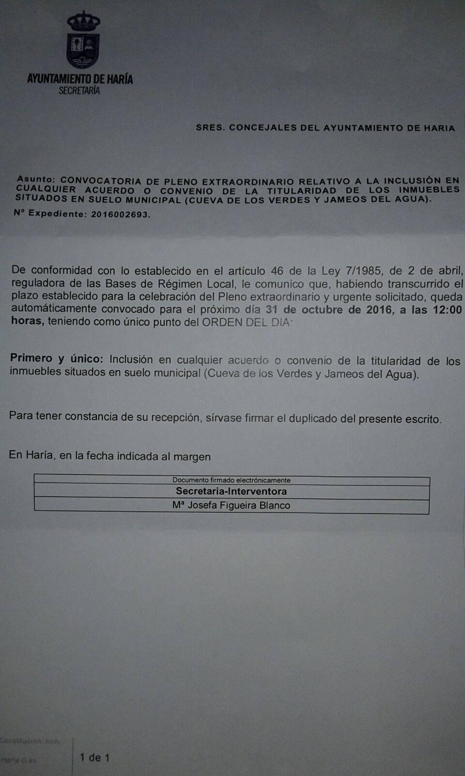 El pleno, convocado ahora por la secretaria municipal, se celebrará el próximo 31 de octubre, a las 12 horas, a pesar de la negativa del alcalde a convocarlo.