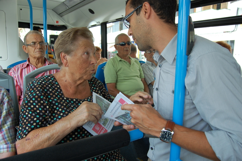 El candidato socialista a la alcaldía capitalina se desplaza a mítines y reuniones en los barrios a bordo de las guaguas municipales