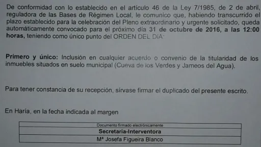 Image La oposición en bloque vota no al acuerdo extrajudicial de la Cueva de los Verdes en el pleno de Haría 30/10/2016 Leer